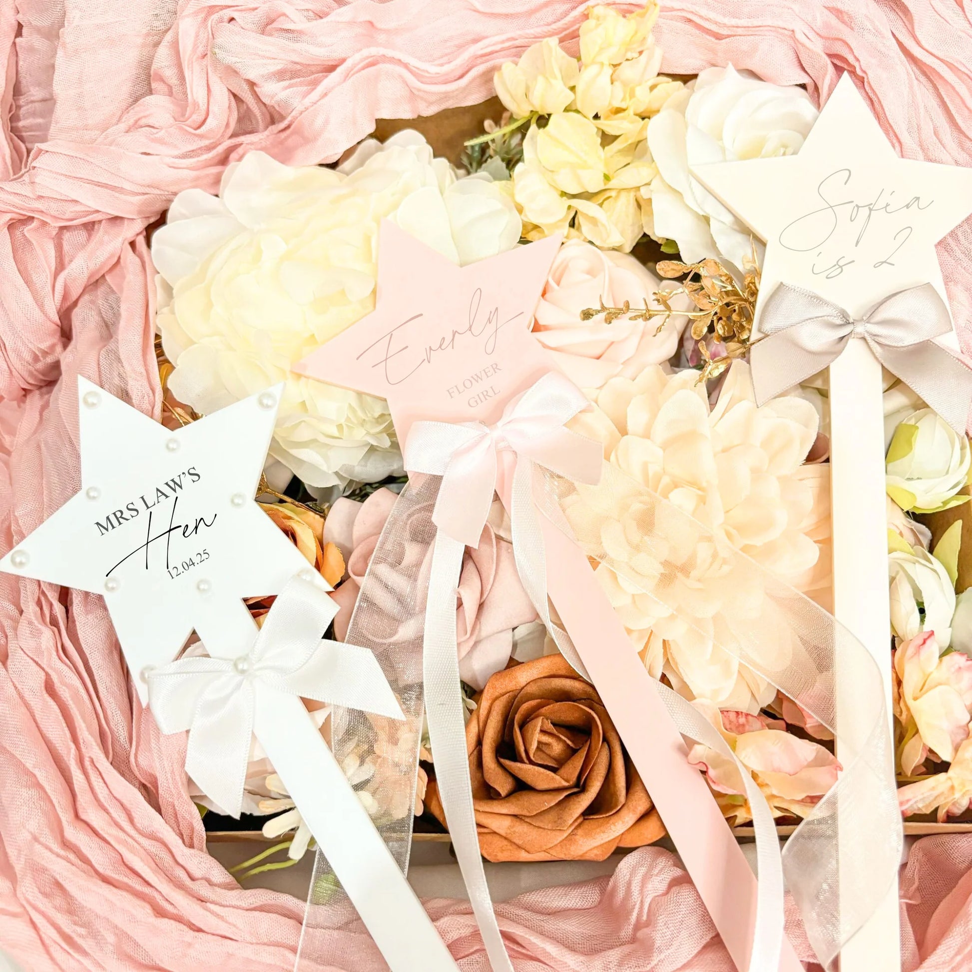 Add a touch of magic to any occasion with our Personalised Acrylic Star Wands! Perfect for weddings, hen dos, or even for little ones who love to play dress-up, these wands are designed to sprinkle a little extra sparkle wherever they go. Choose from five charming colors—White, Cream, Pink, Clear, or Oak—and make them uniquely yours with a custom personalisation!